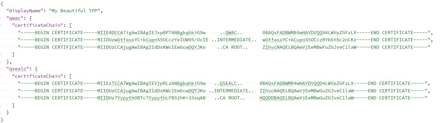 The registration process is a simple POST to the registration endpoint. It contains the name of the TPP as it will be displayed to PSUs as well as the full certificate chains of the QWAC and the QSealC certificates.